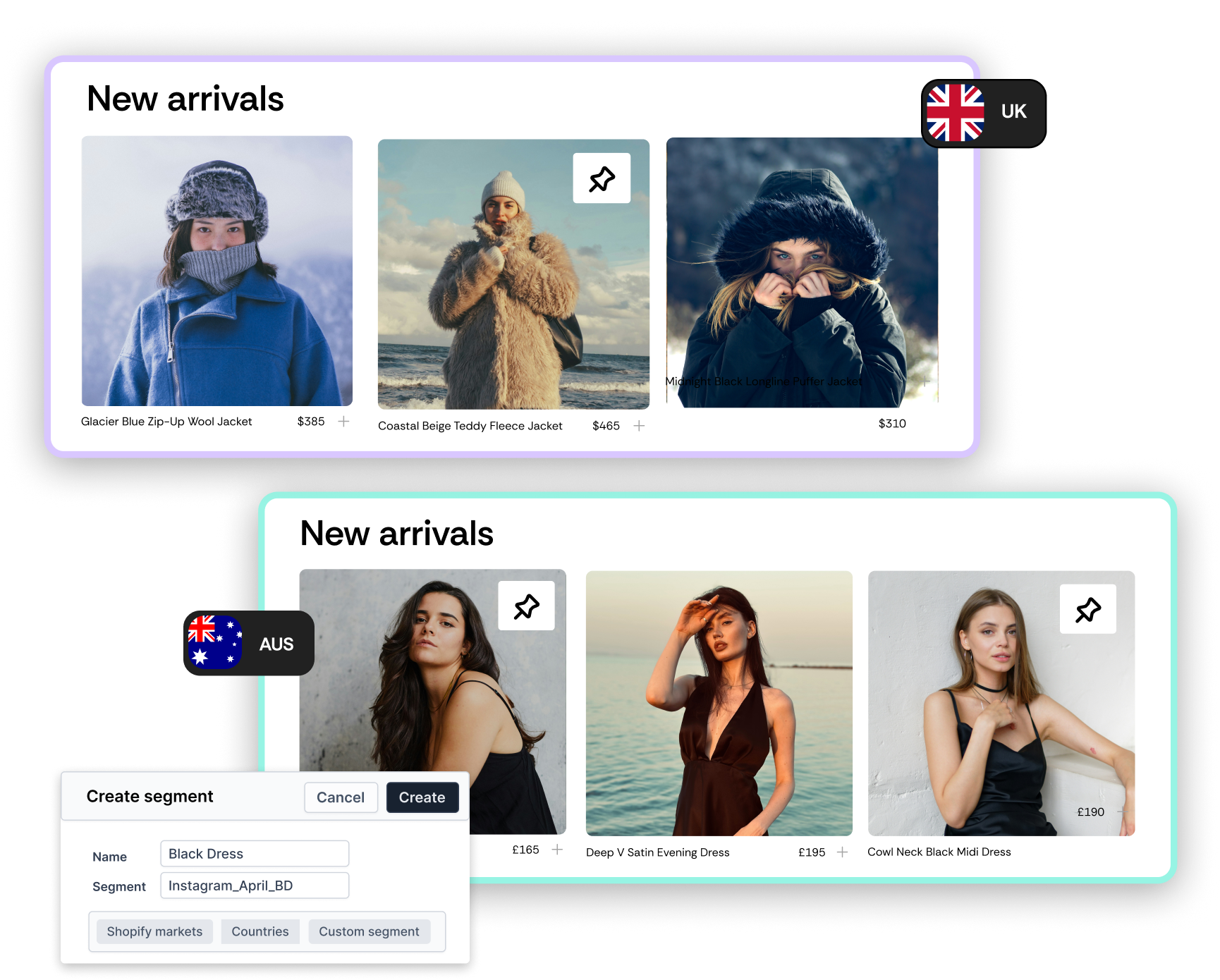Create segment-specific merchandising for campaigns or audience tags, without touching your global collections. Pin different products, sort them differently, and schedule campaigns.